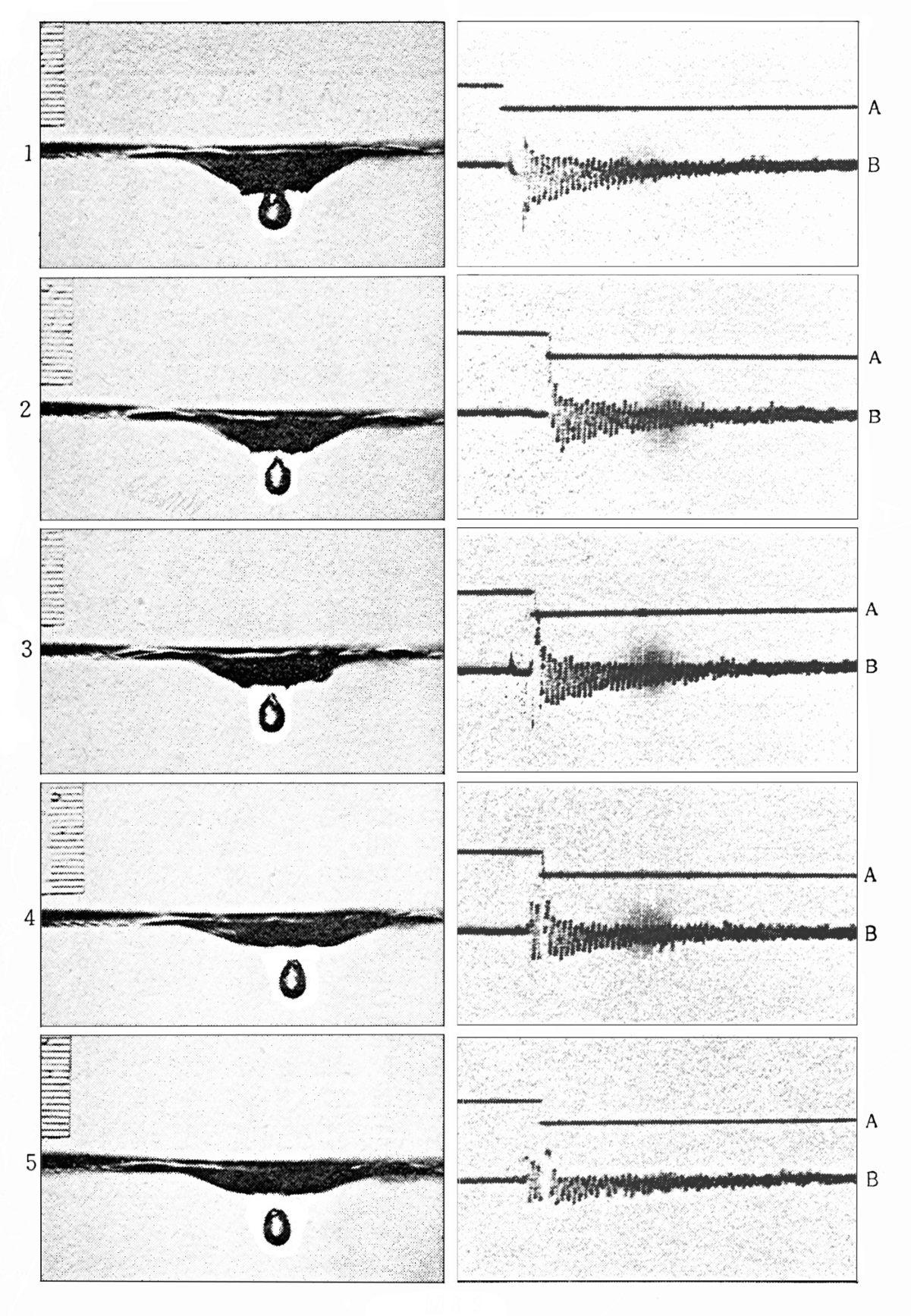 図-2は左列側が気泡のできる過程の瞬間写真、右列側は音波の波形記録Bと、左側の写真をとった瞬間の時刻(水平線Aが一段下がった箇所)とが重ね焼きされている。同氏の記述のままを転記すれば、写真1は音の出始める2ミリ秒前で水平線が下がっており、瞬間写真をみると気泡はまだ凹面の底につながった状態である。写真2はまさに気泡が分離した瞬間に、同3は0.2ミリ秒後に、さらに同4は1.2ミリ秒後に、同5は1.7ミリ秒あとに、それぞれ撮った瞬間写真である。