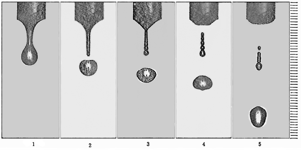 このピョンの成因は、水玉が図-1に示すように大小の千切れた状態で落下することにある。最初の大きい水玉(正)が水面に開けたくぼみ(凹面)の中に、引き続いて小さい水玉(副)がもう一つの小穴をあける(この正・副の時間差≦1/30秒)。ところが大きい穴のほうは今や一斉にしぼみつつあるので、小穴はそのため封じ込められ気泡となる。次いで求心状に立ち上がった